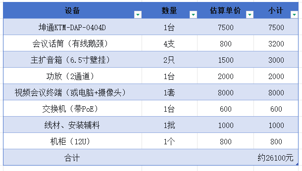 这里面坤通KTM-DAP-0404D只占不到30%。如果你已经有音箱、功放、会议终端,只买0404D替换原来的旧处理器,那投入就只是7500元左右。