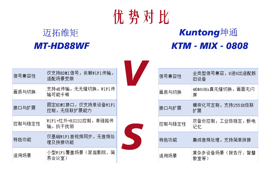 在多媒体会议室的设备间里,负责信号调度的8x8矩阵总扮演着核心角色。今天登场的两位选手风格截然不同:Kuntong坤通 KTM-MIX-0808 混合矩阵 与 迈拓维矩 MT-HD88WF。这不仅是功能对比,更是“有线全兼容”与“无线大集成”两种技术思路的精彩碰撞。