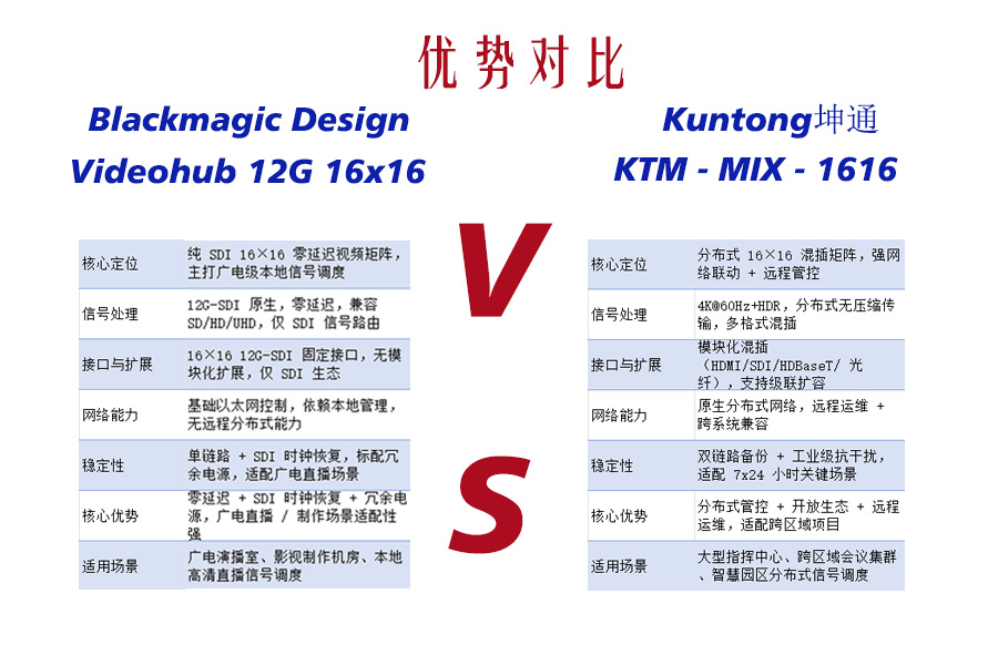 在音视频信号调度的专业领域,选择一台矩阵就像挑选一把趁手的工具,既要看功能广度,也要看专业深度。今天我们把两位16路高手放在一起:全能型的Kuntong坤通 KTM-MIX-1616 混合矩阵,与广电专精的Blackmagic Design Videohub 12G 16x16。这不仅是设备之争,更是“通用灵活性”与“领域专业性”的激情碰撞。