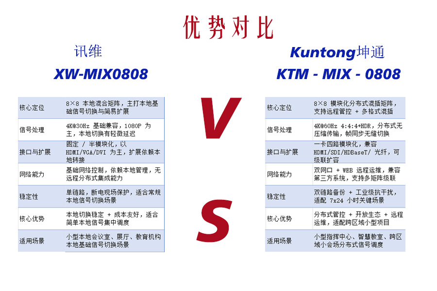 在会议室信号调度设备中,8路混合矩阵是常见且核心的选择。当两款产品拥有相似型号时,它们的差异往往体现在更深层的设计理念上。今天,我们就来聊聊这场“同门对决”:Kuntong坤通 KTM-MIX-0808混合矩阵与讯维 XW-MIX0808混合矩阵。它们都姓“MIX-0808”。