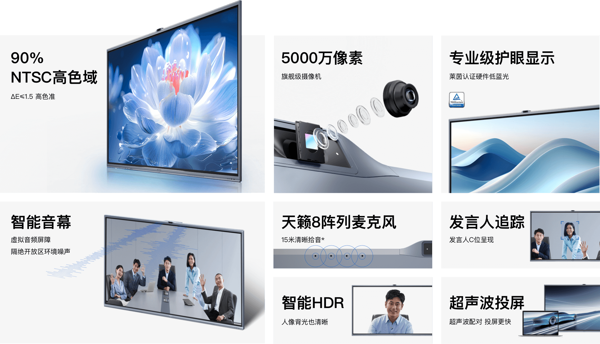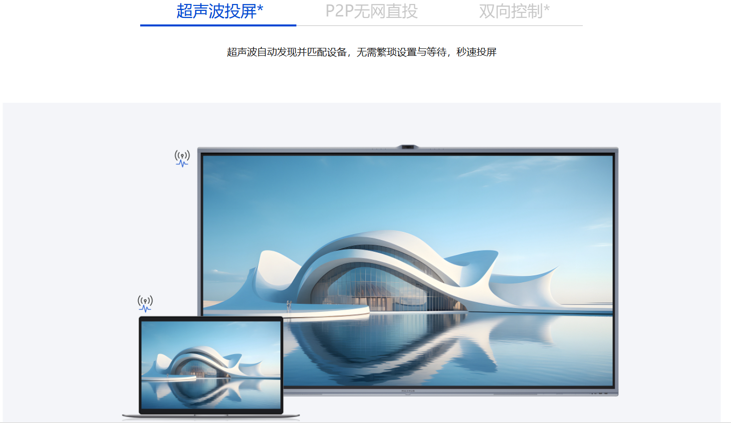 *超声波投屏:超声波用于发现和匹配会议设备,实现快速投屏,投屏电脑需安装传屏助手,并开启超声波连接功能。