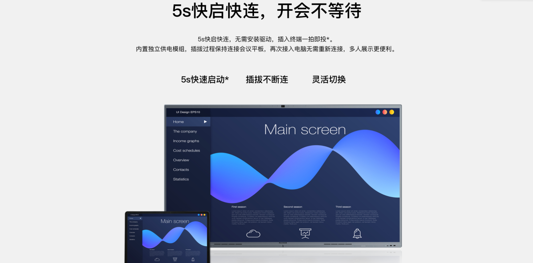 *5s快速启动:在无其他干扰的 MAXHUB 实验室环境下,使用Macbook Air 电脑连接会议平板,在屏分率2560*1600下测试所得结果。