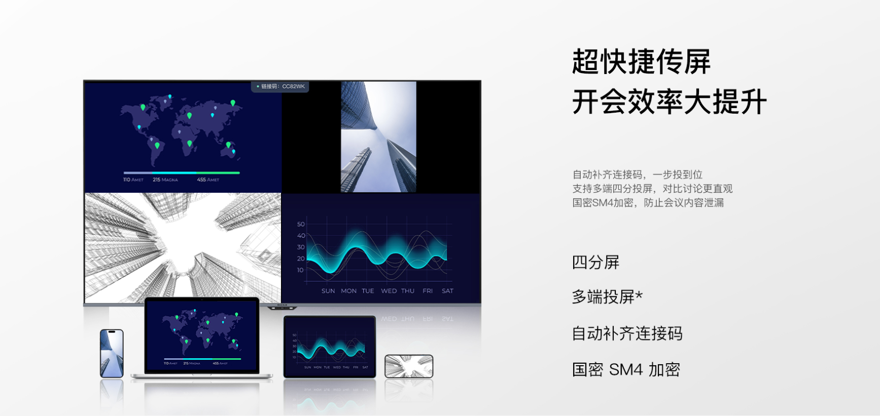 *多端投屏:支持手机、电脑、平板端传屏,PC 端支持 Windows7、macOS10.10及以上,手机、平板传屏支持 Android5.0、iOS9.0及以上操作系统电脑可通过连接MAXHUB传屏器投屏,且第一次使用,传屏器需与MAXHUB 智会屏标准款配对;电脑、手机、平板可通过下载MAXHUB传屏助手APP实现投屏