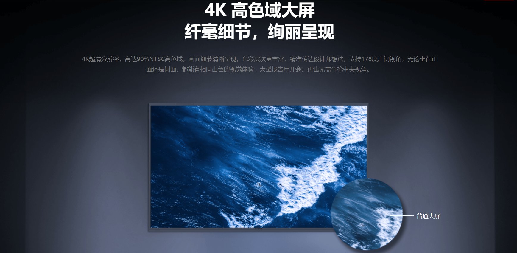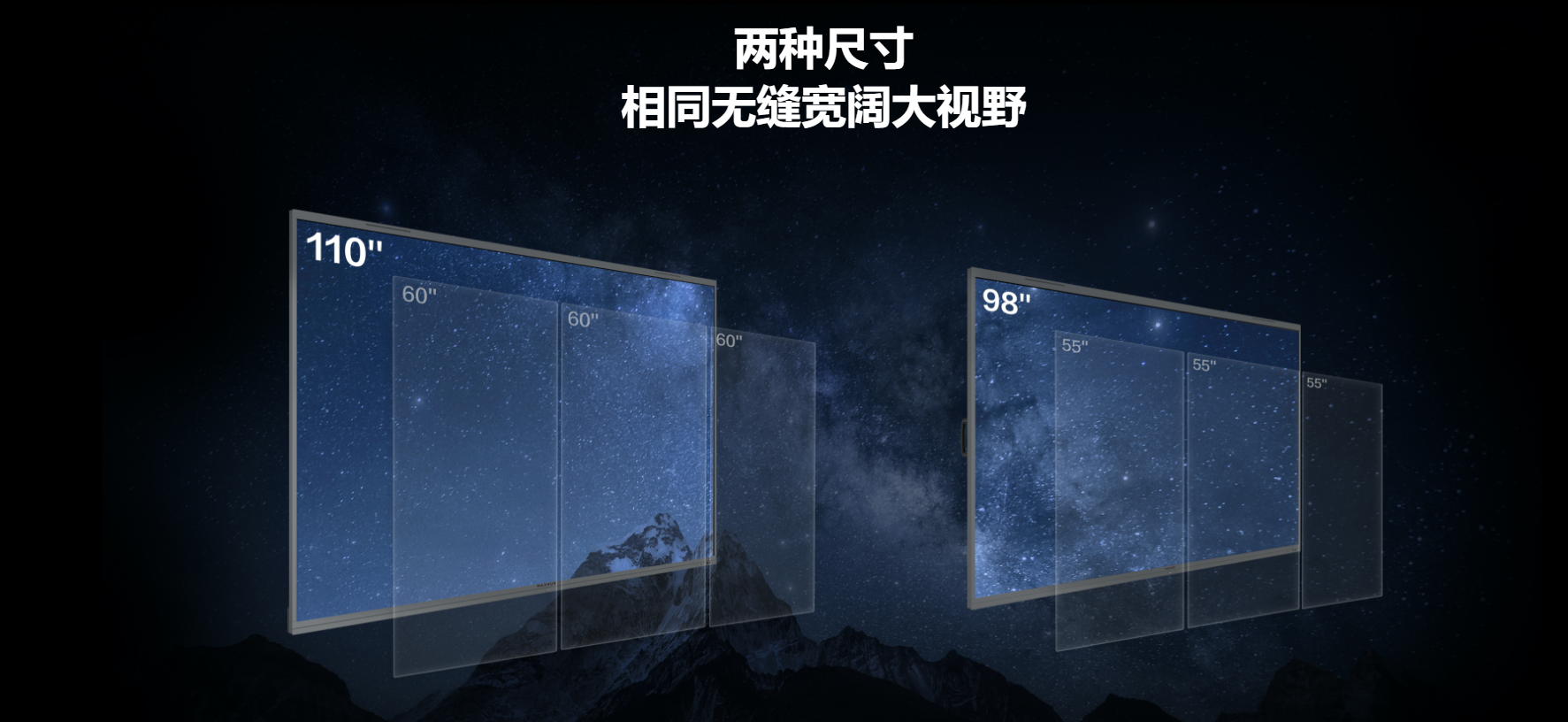 *98'' 相当于3个55英寸显示设备:98''最大显示面积为2158.848(H)×1214.352(V)=2621601.39mm²,55''最大显示面积为1217.6(H)x684.9(v)=833934.24mm²,98''最大显示面积/55''最大显示面积 =2621601.39/833934.24=3.14