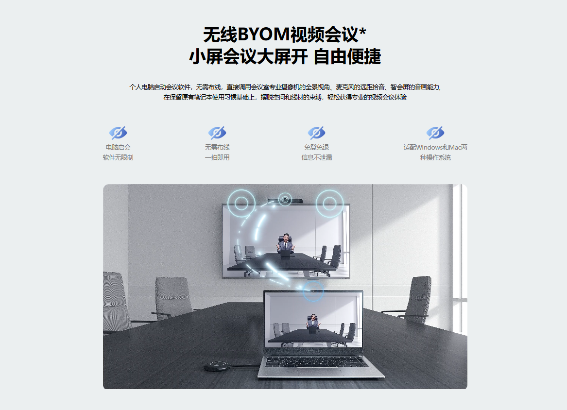 *无线BYOM视频会议:需插入MAXHUB传屏器 WT12,并连接到智会屏,在视频会议软件中分别切换摄像头、麦克风、扬声器为M-Media。仅支持Windows 10、Mac 10.13及以上版本。